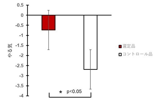 サンプルは100回以上作製することもある中、28回のサンプル作製で、当社の既存品にはない、運動時のやる気を向上させる独自のゼリー飲料配合を導き出しました。最終的に他の官能評価も考慮した選定品は、主観評価において、フェイススケール法でコントロール品より5%水準で有意にやる気が高くなりました。両者がマイナスなのは、運動後の値から運動前の値を引いた差分で示しているためで、選定品は運動によってやる気の低下幅が抑えられていることを意味します。選定品とコントロール品の比較評価で、選定品はコントロール品よりも、ゼリー表面の摩擦性が低く、ストローから押し出した粒が大きく、ゲルを押しつぶす前の離水が多く、押しつぶした後の離水は少ないという特徴を有していることが示されました。本研究は、2026年3月18日に開催された第21回日本感性工学会春季大会において発表しました。