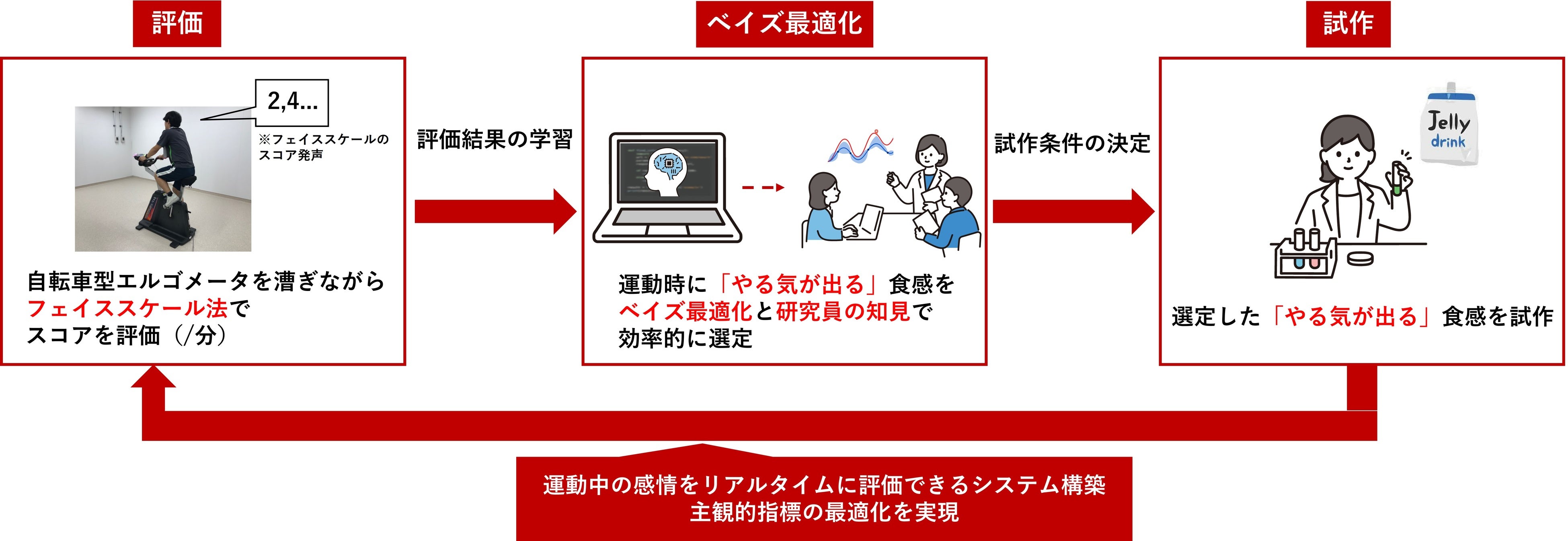 ベイズ最適化は、少量データから逐次的に条件探索し最適解を見出すAIアルゴリズムの一つとして、多くの応用が報告されています。その実施には、定量・高精度なデータ取得および試行結果の定量化が不可欠ですが、食品分野では「おいしさ」など主観的感性指標が多く、ベイズ最適化の適用に課題がありました。