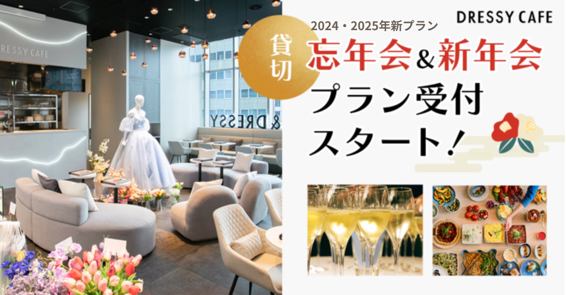 「PLACOLE & DRESSY」がプロデュースするウェディングのテーマパークカフェ『DRESSY CAFE』では、名古屋店・鎌倉店それぞれで忘年会や新年会に最適な貸切パーティープランの予約受付を開始しました。企業や団体様向けのイベントとして、親睦会や送別会、歓送迎会、さらには個人の誕生日パーティーや結婚式の二次会など、さまざまなシーンに対応したプランをご用意しております。