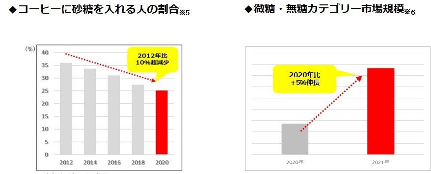 また、チルドコーヒー飲料市場においても、2021年は「微糖・無糖」ジャンルが2020年比105%と伸長しており※6、今後も“甘くない”コーヒーの市場は、まだまだ拡大していくことが見込まれています。