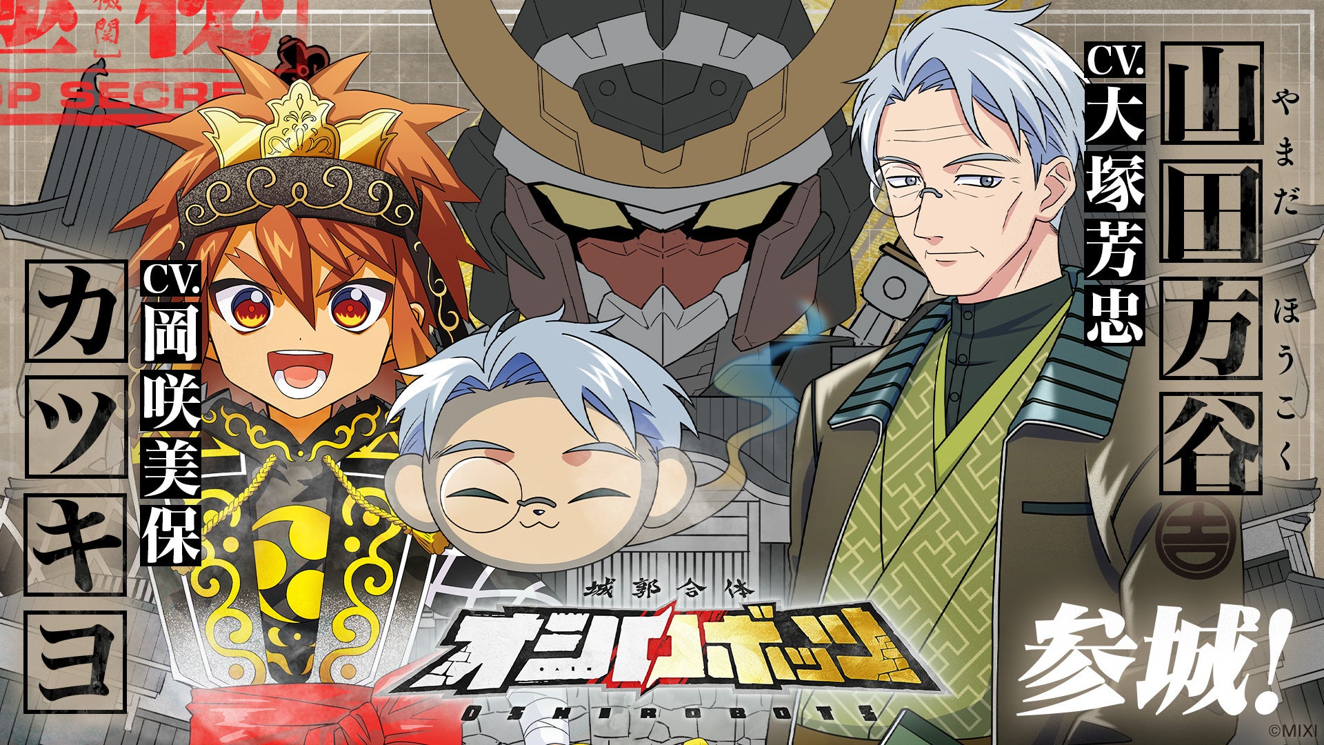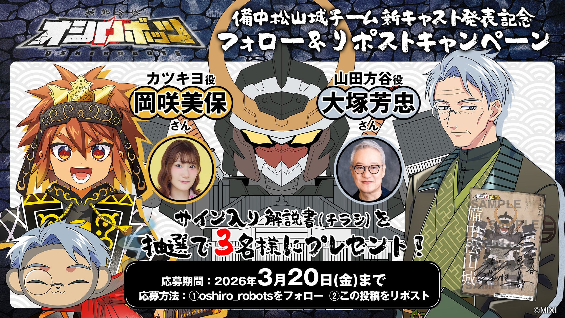 株式会社MIXI(東京都渋谷区、代表取締役社長 上級執行役員 CEO:木村 弘毅)は、MIXI_ANIMEオリジナルコンテンツ『城郭合体オシロボッツ』において、オシロボット備中松山城パイロット「カツキヨ」役を岡咲美保さん、シロダマ(武将)「山田方谷」役を大塚芳忠さんが担当することをお知らせします。このキャスト発表を記念して、サイン入り解説書(チラシ)が抽選で当たるキャンペーンも実施します。今後も各オシロボットのパイロットおよびシロダマ(武将)のキャラクターボイス(CV)を順次追加していく予定です。