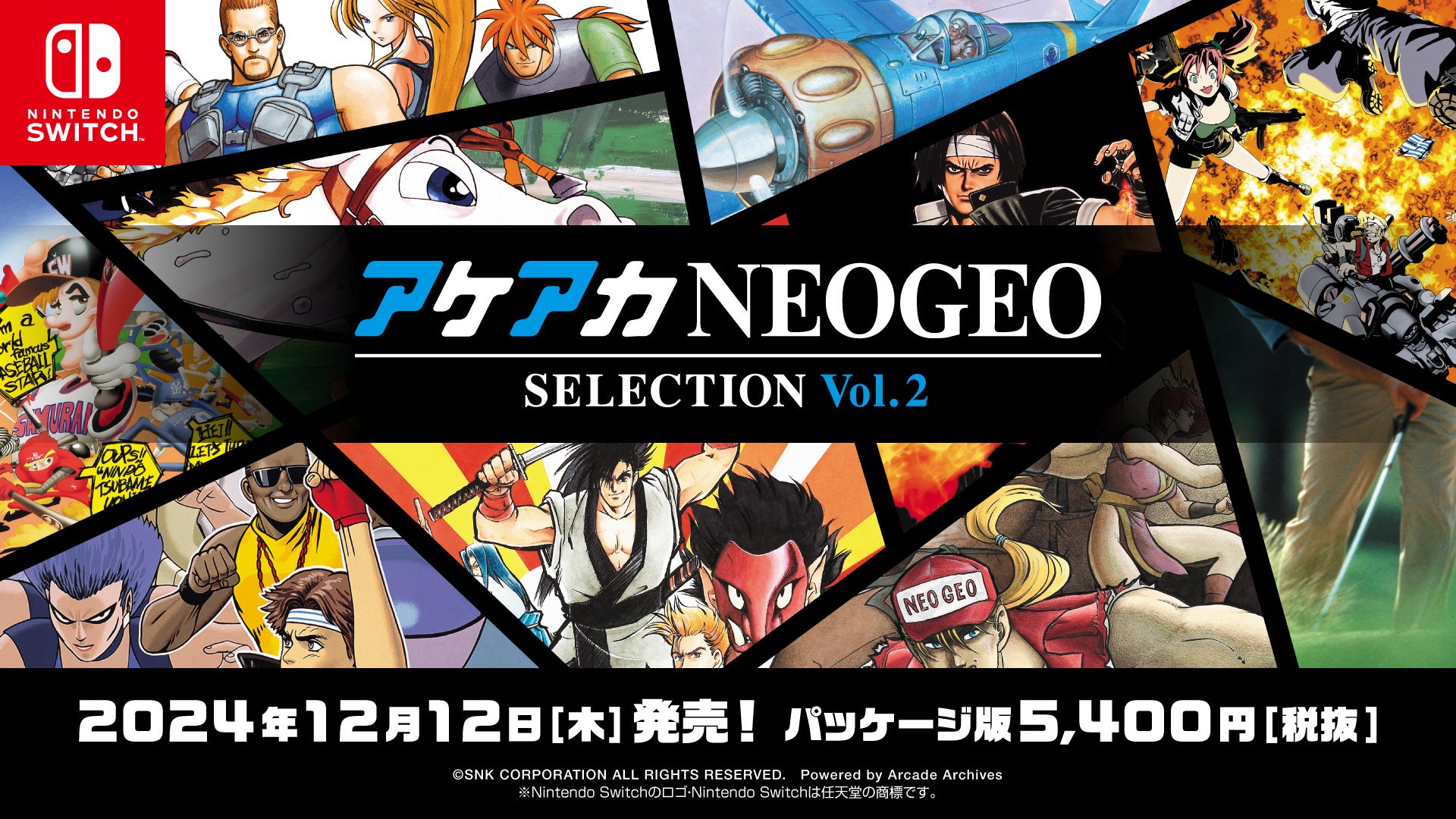 式会社SNK (本社:大阪府大阪市、代表取締役社長:松原 健二)は、「NEOGEO」の名作・傑作ゲームを10タイトル収録したコレクション作品『アケアカNEOGEO セレクション Vol.1』、『アケアカNEOGEO セレクション Vol.2』を、Nintendo Switch™のパッケージ版として、2024年12月12日(木)に2本同時発売することをお知らせいたします。