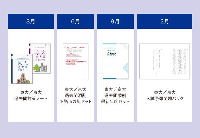 東大講座・京大講座を1講座でも3月から受講開始した方限定で、追加受講費なしで、東大・京大合格をサポートする特別教材を年4回お届けします。