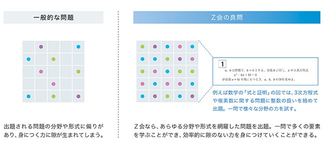 Z会は、大学の出題形式に似せただけの問題を出題するのではなく、各大学の出題傾向を徹底的に分析した上で大学で求められる力を踏まえ、様々な分野・形式を網羅して考え抜くに値する良問を出題します。受験生は、厳選された良問に取り組み考え抜く経験を積んでいくことで、限られた時間の中で、効率よく難関大入試に対応できる隙のない力をつけることができます。