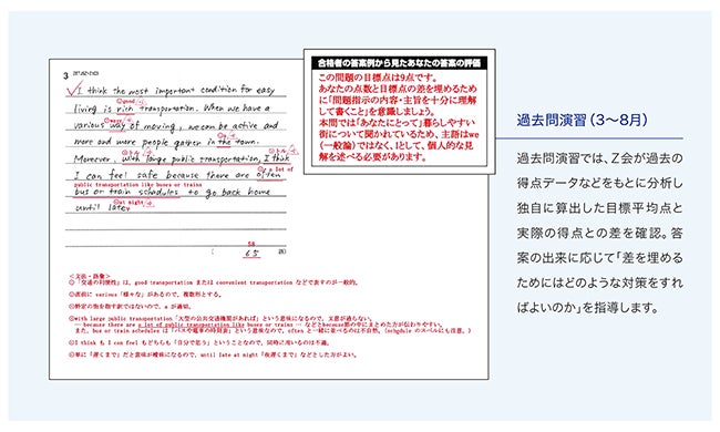 3〜8月の英・数・国では、月2回の「入試演習」に加えて、東大・京大の過去問から厳選した1問を出題。Z会を受講するだけで、過去問演習にも効率的に取り組むことができます。また、過去問演習の添削指導では、Z会が過去の得点データなどをもとに分析し、独自に算出した目標平均点と実際の得点の差を確認。答案の出来に応じて「差を埋めるためにはどのような対策をすればよいのか」を指導します。