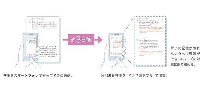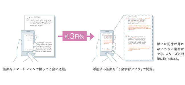 答案提出・返却のプロセスを大きく見直し、スピーディーな答案提出、迅速な答案返却を実現しました。添削問題を解き終えたら、スマートフォンで撮影してアプリから送信するだけで、簡単に答案を提出できます。提出された答案にはデジタル形式の添削を行い、Z会受付日から約3日で「Z会学習アプリ」に答案を返却しますので、答案を作成した記憶がまだ残っているうちにスピーディーに復習ができ、無駄なく学習を進められます。