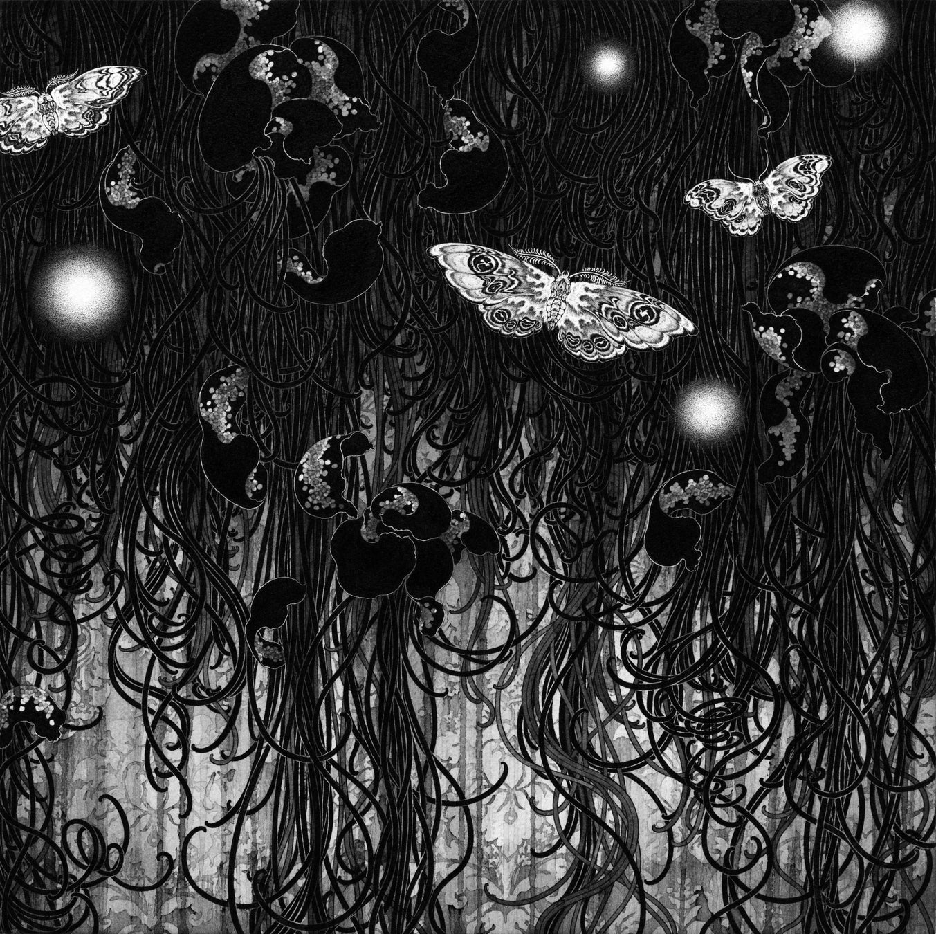 ましもゆきは、白と黒のみのシンプルな色彩でありながら、緻密な描き込みとインクの濃淡で、花、蛾、文様のうごめく魅惑の世界を表現するアーティストです。