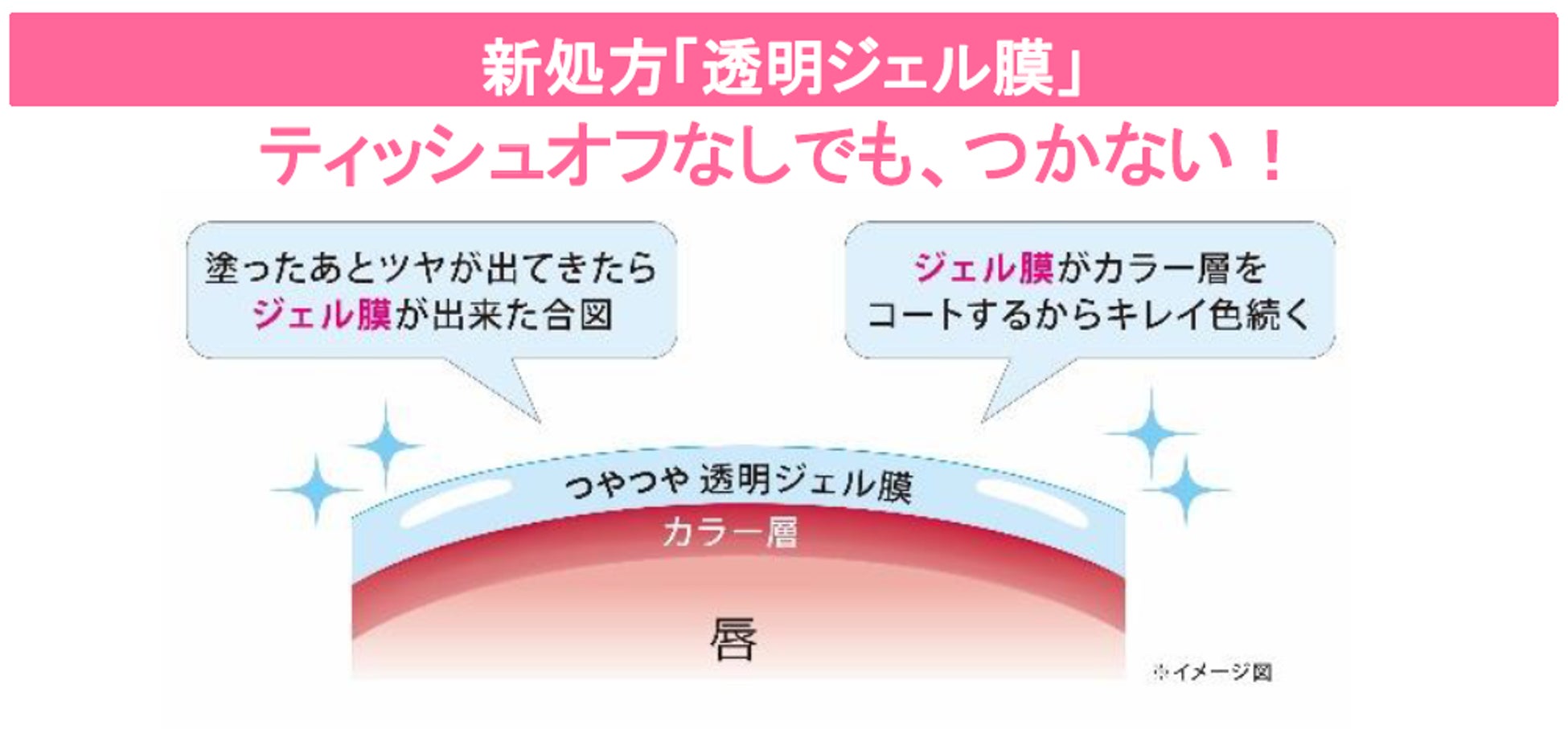 唇に色が密着し、「透明ジェル膜」が唇をコート。