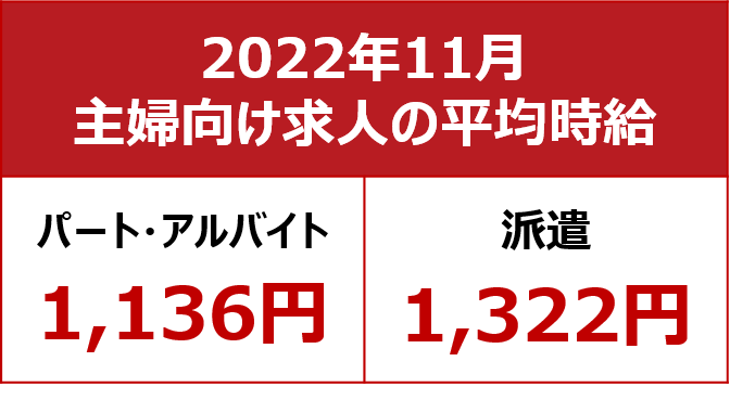 【2022年11月 主婦求人の平均時給】パート・アルバイト:『1,136円』、派遣:『1,322円』