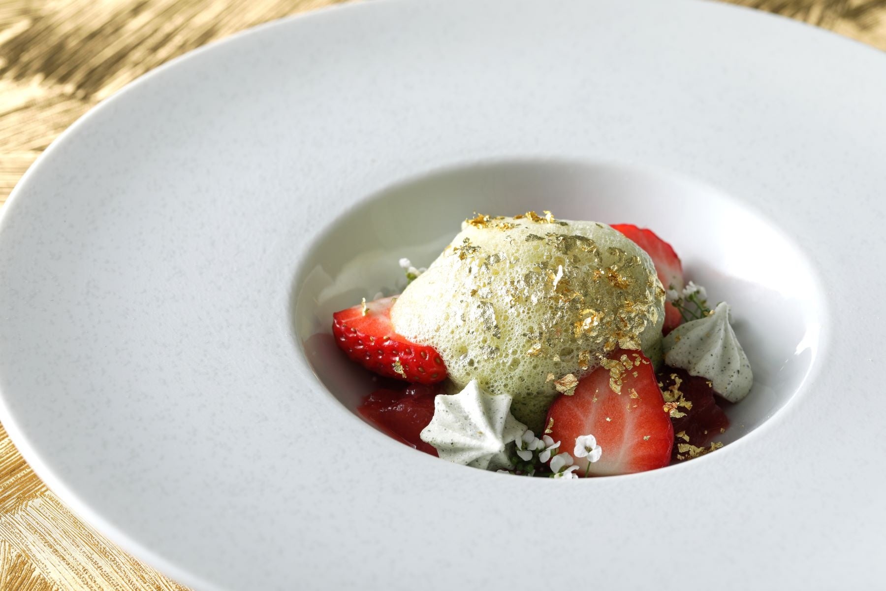 ・デザート:伊勢茶のパルフェ 三重いちごと伊勢茶の泡を添えて/珈琲または紅茶