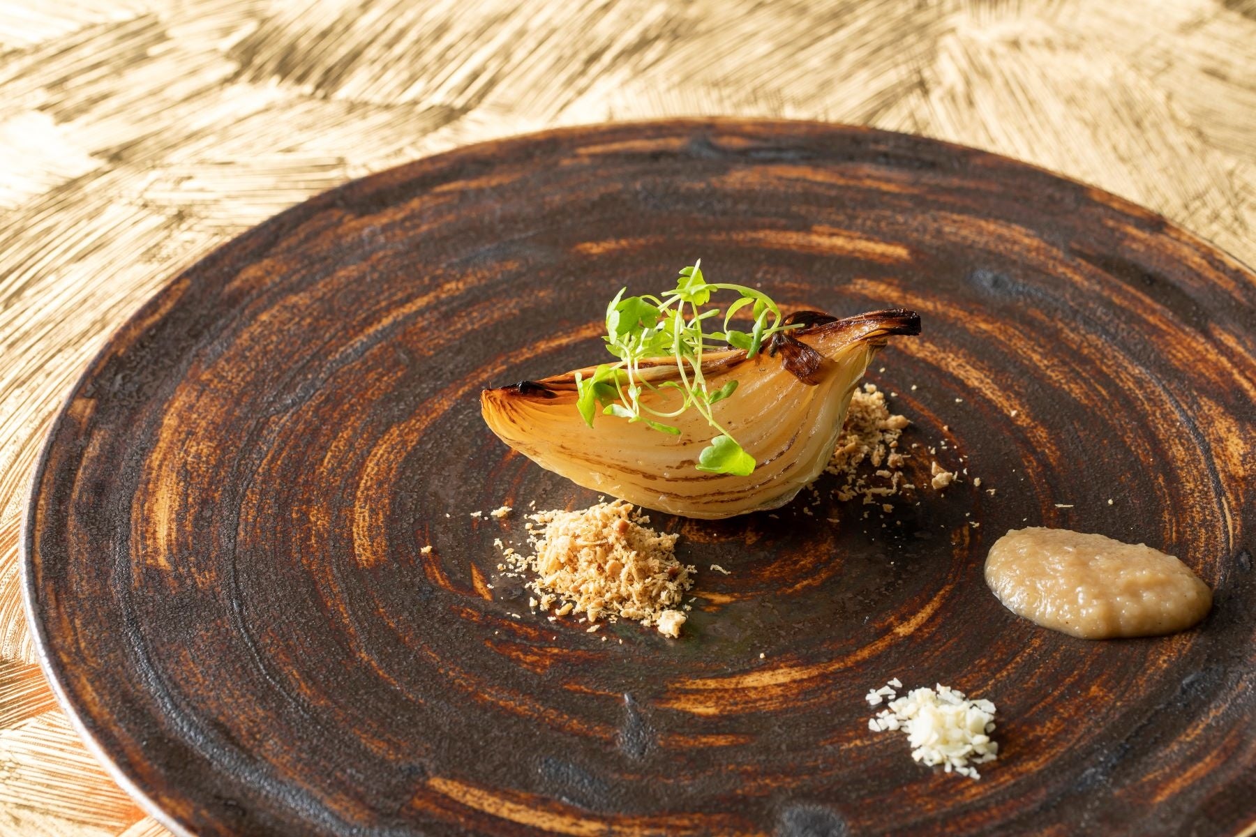・おもてなしの一品:新玉葱のロースト 塩麴のソースとデュカの香り