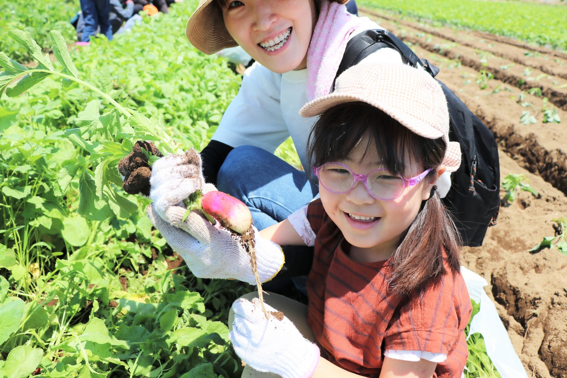 体験会は利根川生産者グループが提供する「みんなの畑」で、赤ねぎをメインに育てる「ねぎねぎコース」年間4企画の初回です。利用者家族約60人が、生産者と一緒に赤ねぎとさつまいもの苗を植え付け、畑の草取りをして大根を収穫します。6月には草取りとじゃがいも掘り、11月には赤ねぎの収穫と焼きねぎ、焼き芋の試食を予定します。参加者は自ら畑の手入れをすることで、食べ物が育つ過程に必要な時間を知り、手間を体験します。