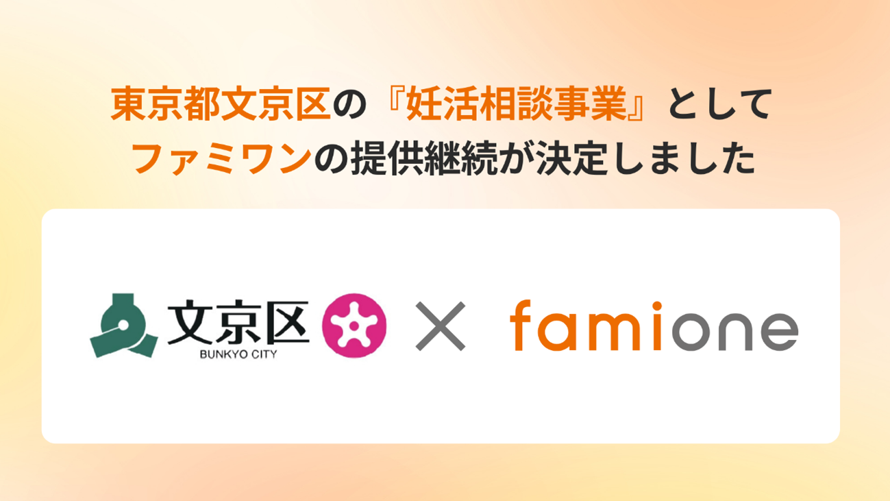 「子どもを願うすべての人によりそい 幸せな人生を歩める社会をつくる」をビジョンに掲げ、法人の従業員向け福利厚生や自治体の住民向け支援を行うヘルスケアサポートサービス「ファミワン」 https://famione.com/benefit/ などを展開する株式会社ファミワン(本社:東京都渋谷区、代表取締役:石川 勇介)は、東京都文京区(区長:成澤 廣修、以下文京区)からの委託を受け、「妊活相談事業」において、令和8年度のサービスの提供継続が決定いたしました。