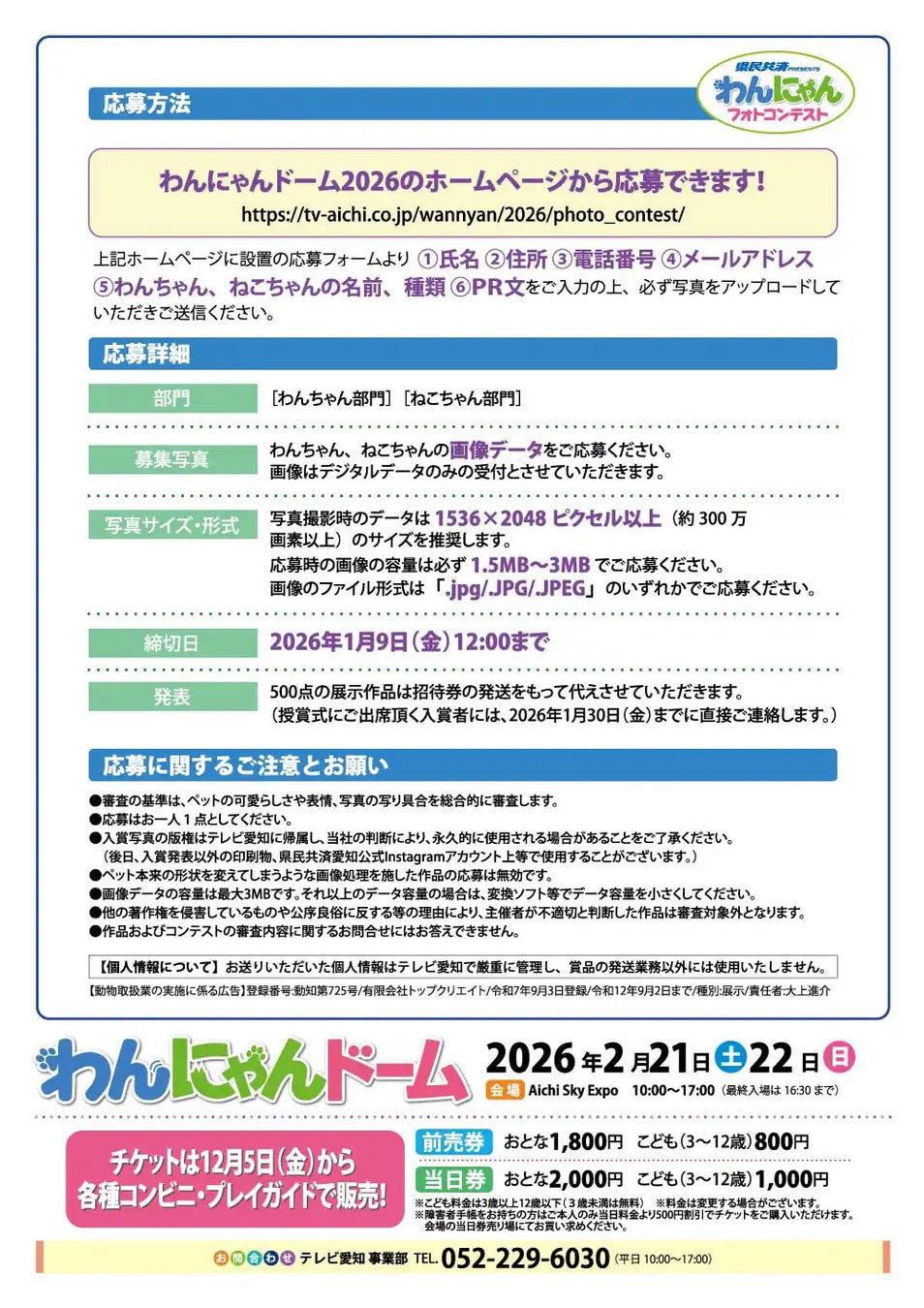 テレビ愛知では2026年2月21日(土)・22日(日)の2日間、愛知県常滑市のAichi Sky Expo(愛知県国際展示場)」にて「わんにゃんドーム2026 in Aichi Sky Expo」を開催します。ペット同伴で楽しむことができる東海地区最大級のペットイベントして23回目の開催となる「わんにゃんドーム」。こちらの催しの恒例企画となっている「わんにゃんフォトコンテスト」の募集がスタートしました。