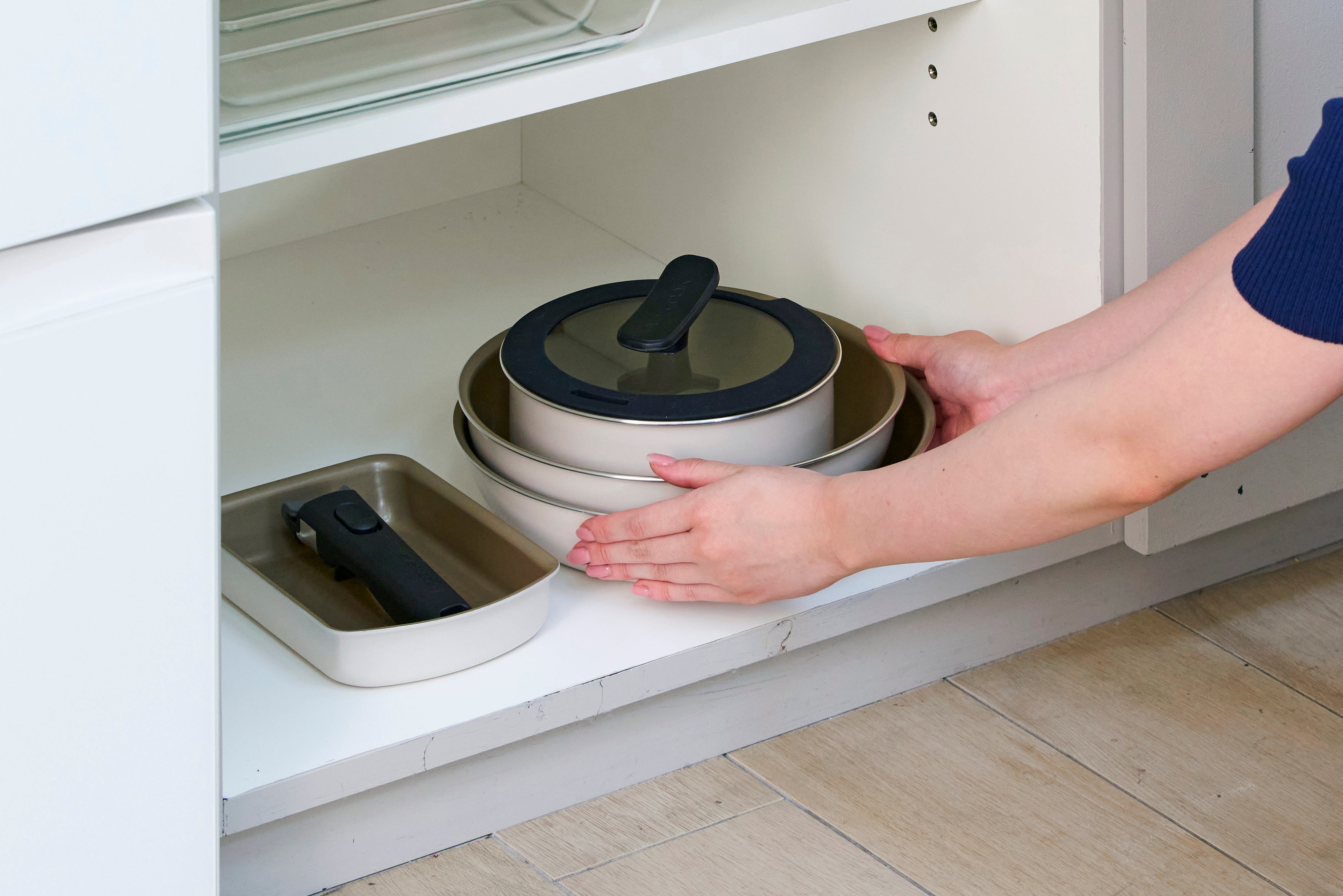 専用ハンドルがフライパンから外せるので、フライパンやポットを重ねて収納できます。ごちゃつきやすいキッチン収納庫もコンパクトにスッキリします。