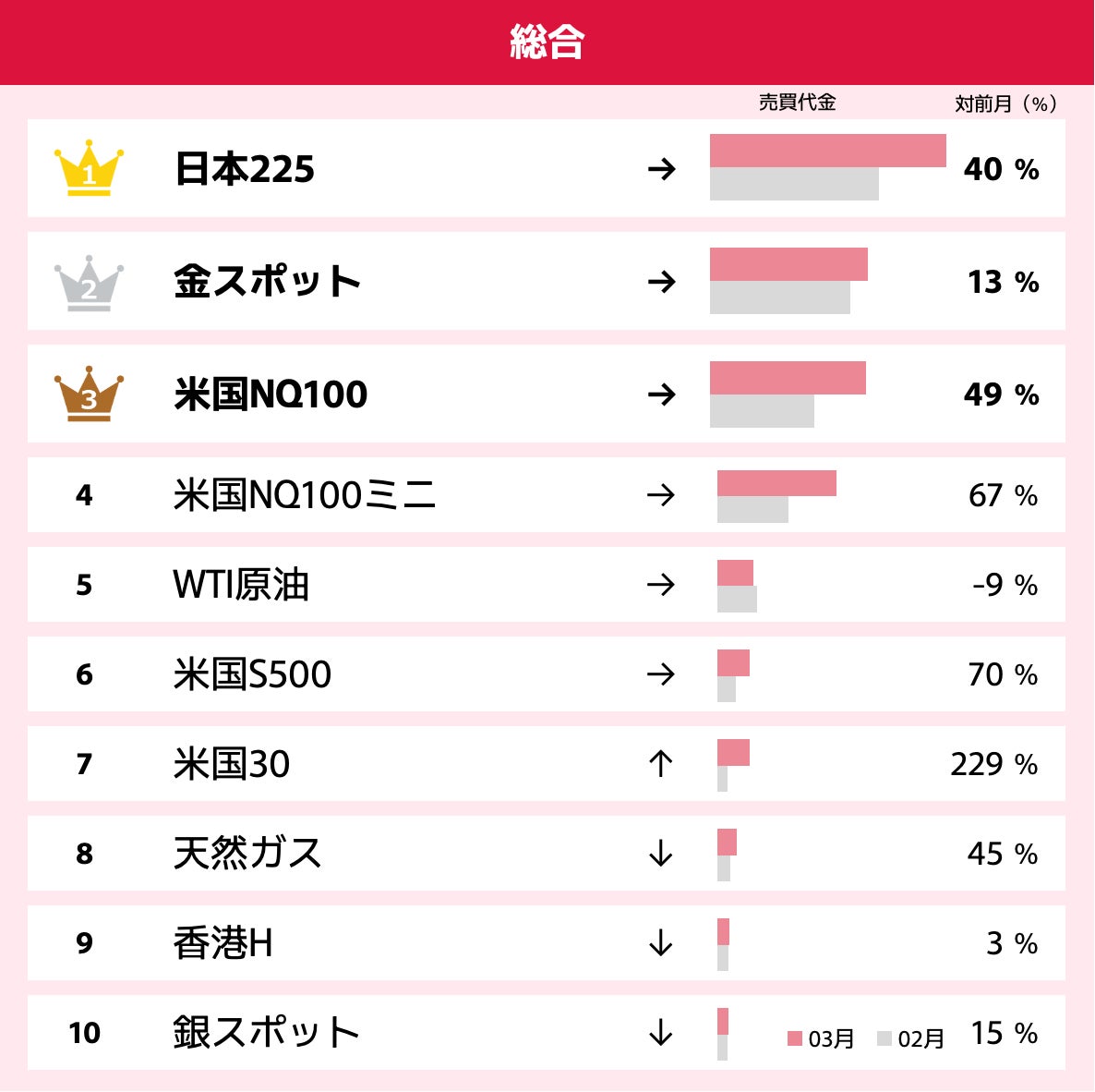 2025年3月は、世界的な政治・経済の不確実性を背景に「安全資産」として知られる金(ゴールド)の価格が上昇傾向で推移し、国際価格・日本国内の小売価格ともに史上最高値の更新が続いたことから、当社の商品CFD「金スポット」の売買代金は前月に続き高水準となり、2ヶ月連続で総合ランキングの2位、商品CFDランキングにおいては5ヶ月連続の首位にランクインしました。