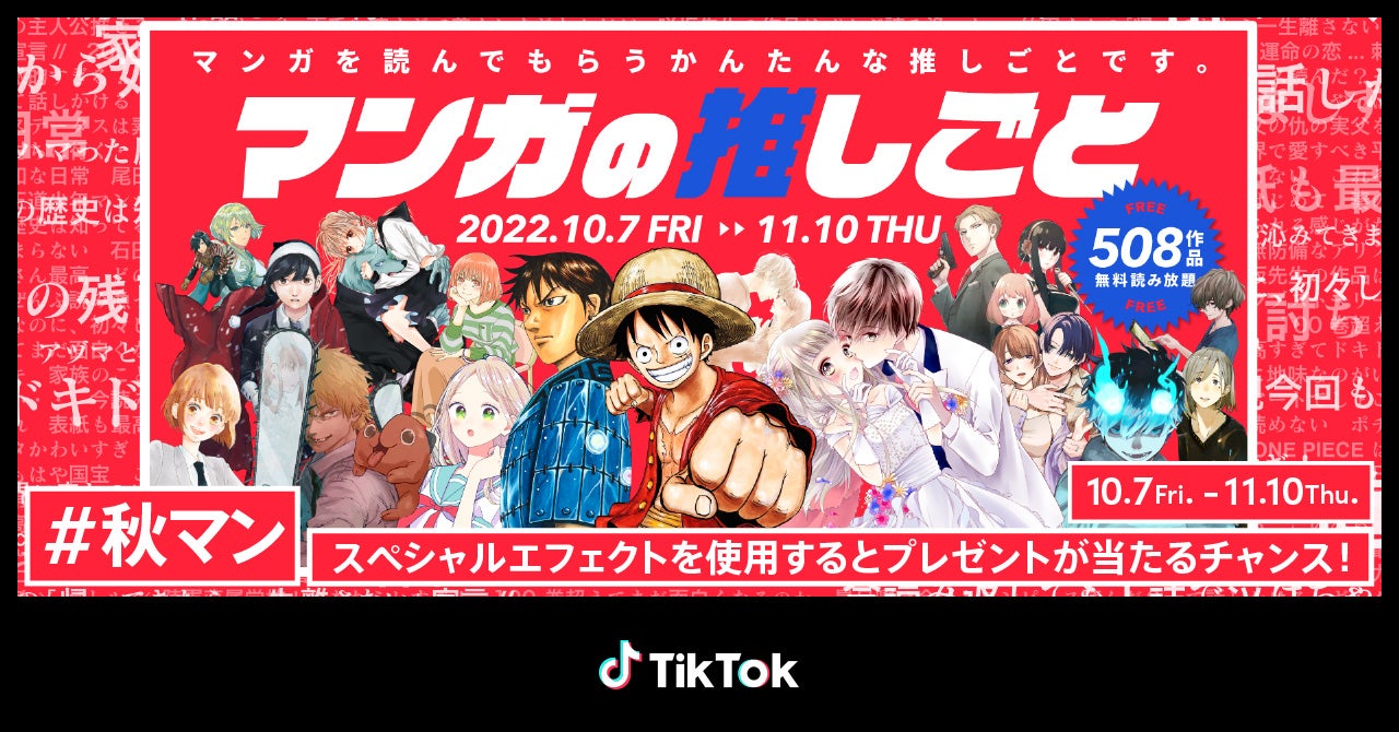 ●参加方法:集英社マンガ公式TikTokアカウント(https://www.tiktok.com/@shueisha_manga)をフォローした上で、コラボエフェクトまたはステッカーを使用し、ハッシュタグ「#秋マン」を付けて動画を投稿。