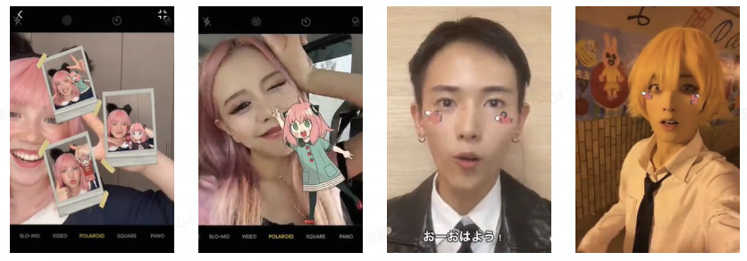 『チェンソーマン』は目の下にランダムにいろんなポージングをしたポチタが登場してかわいく一緒に撮影ができます。『SPY×FAMILY』は、アーニャと一緒に撮影が可能、『僕とロボコ』は好みの食べ物で「押忍!!クソ男飯!!」の世界観が体験できるエフェクトに。『スナックバス江』はユーモラスなセリフと、目を当てはめてそのキャラになりきることができる目の当てはめエフェクトで、『ダンダダン』はチャーミングなターボババア猫がタップの数に応じて走り抜けるゲーム系のエフェクト、少女マンガ診断はユーザーが顔出しをせずに身振り手振りでヒロイン気分を楽しめるエフェクトに仕上がっています。