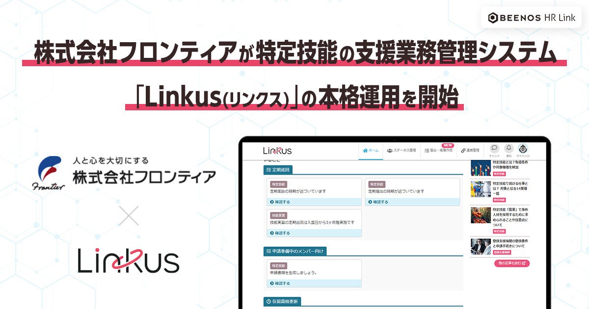BEENOS株式会社(東証プライム:3328)の連結子会社であるBEENOS HR Link株式会社(以下「BEENOS HR Link」)が運営する特定技能の支援業務管理システム「Linkus(リンクス)」は、介護事業や薬剤事業などを展開する株式会社フロンティア(本社:大阪市淀川区、千葉県千葉市美浜区 代表取締役社長:重森裕之、以下フロンティア)に導入され、本格運用が開始されました。