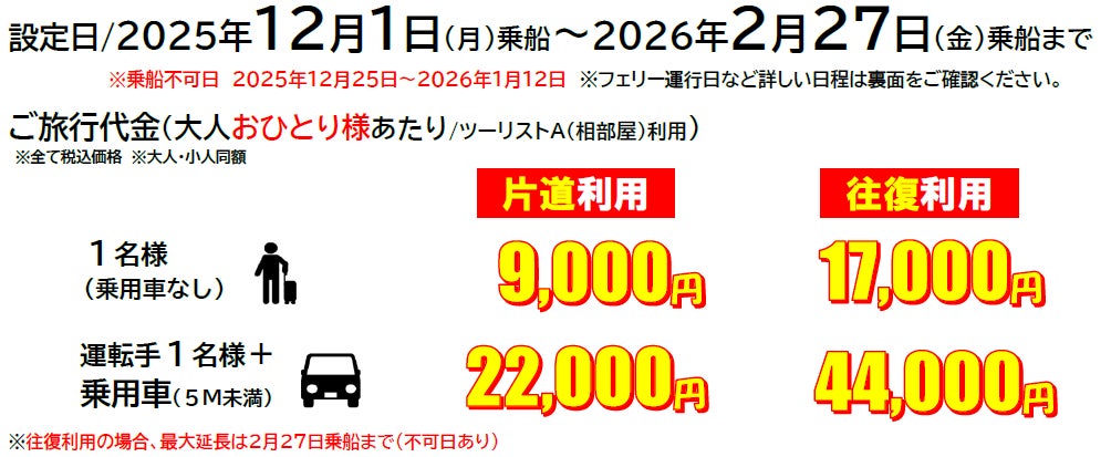 おひとり様から乗用車付き、片道のみ、往復利用など自由度の高い商品となっております。