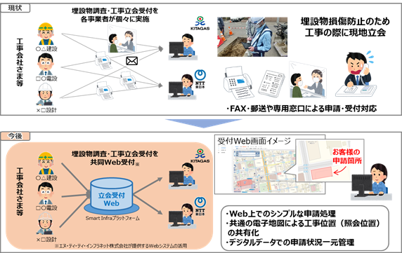 NTTインフラネットが提供する「立会受付Webシステム」は、工事会社が複数のライフライン事業者へ申請することなくワンストップで対応が可能となり、工事会社並びにライフライン事業者の受付業務の効率化が図られます。