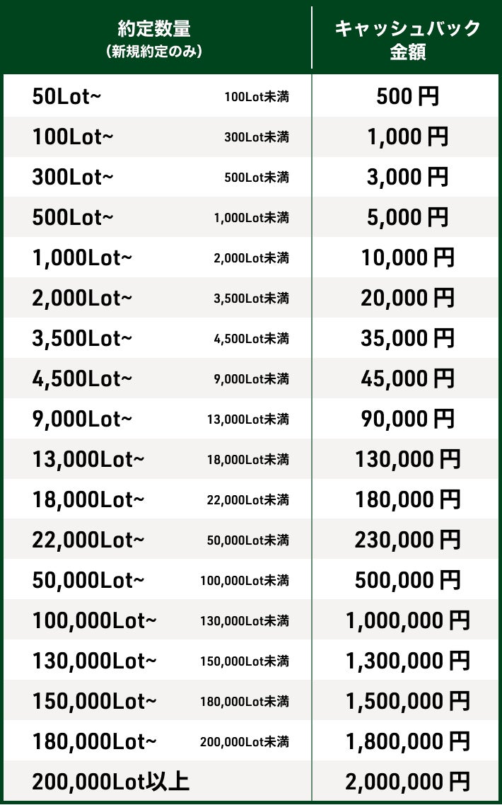 本キャンペーンは、2023年12月1日(金)~2024年1月31日(水)の期間中、FX口座における対象通貨ペアの新規約定数量を合算し、合計数量に応じて最大200万円をキャッシュバックいたします。