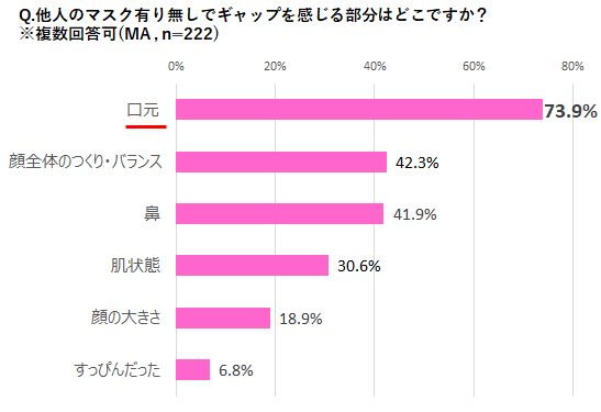 他人のマスクを外した顔にギャップを感じたことがある人は8割近くとかなり多くなっています。その要因は口元が7割越えとダントツ1位で、2位の「顔全体のバランス」は4割越えとなっていました。普段マスクで隠れている口元は、顔全体の印象において重要なようです。
