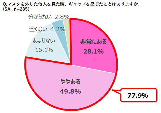 - 他人の顔、マスク有り無しでギャップを感じたことがある人は8割近く!要因は「口元」が最多
