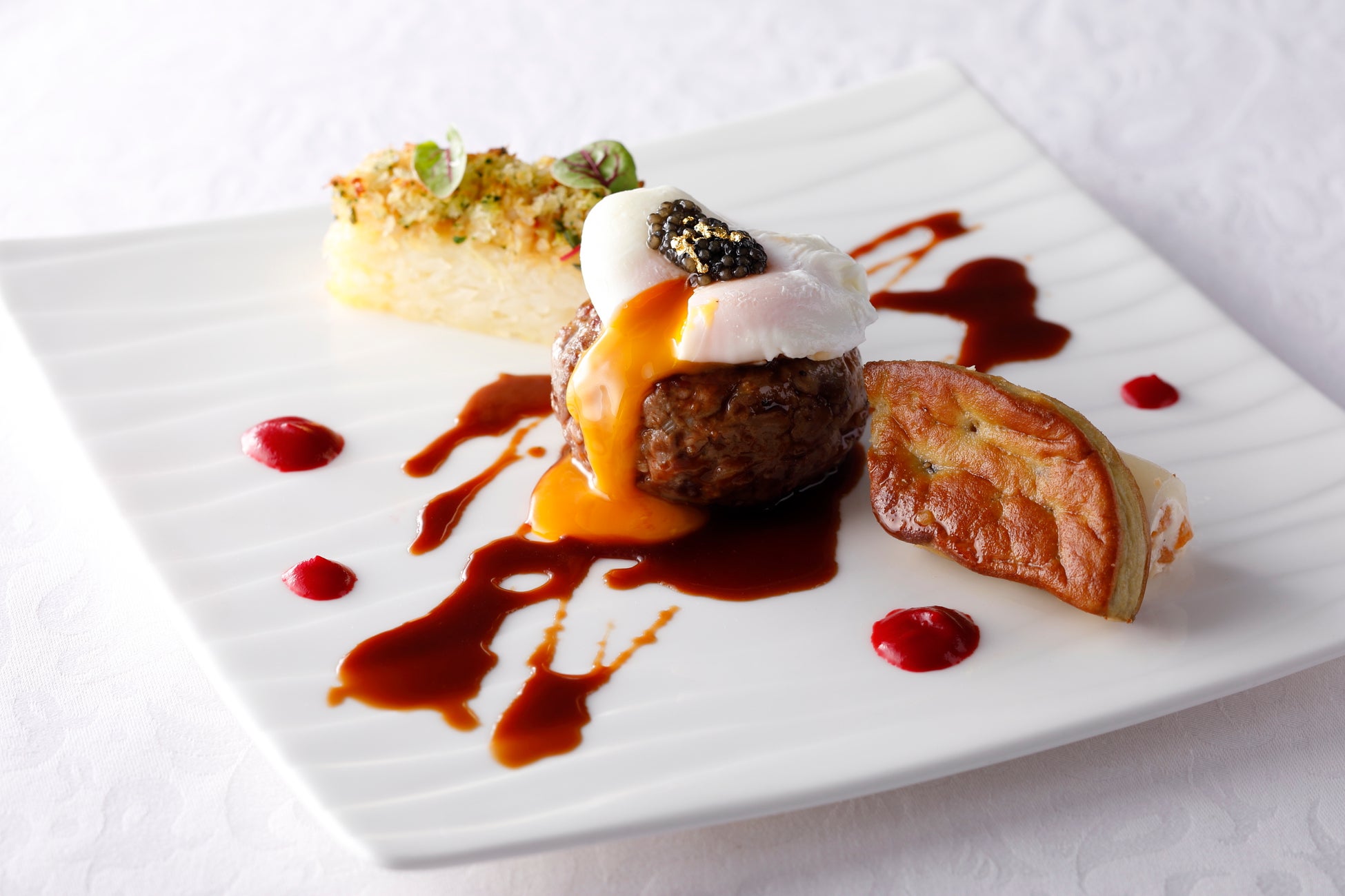 濃厚で味わい豊かな短角牛をオーダーが入ってから粗みじんにし、つなぎ無しで焼くことでお肉本来の美味しさを味わっていただけます。芳醇でコクのあるマデラソースでロッシーニ風に仕上げました。マデラソースはアクセントにトリュフを使用しています。ポーチドエッグの上に乗せたキャビアや、付け合わせに添えたフォアグラが贅沢な一皿です。“いわいずみ短角牛”と世界三大珍味の味わいをご堪能いただけます。