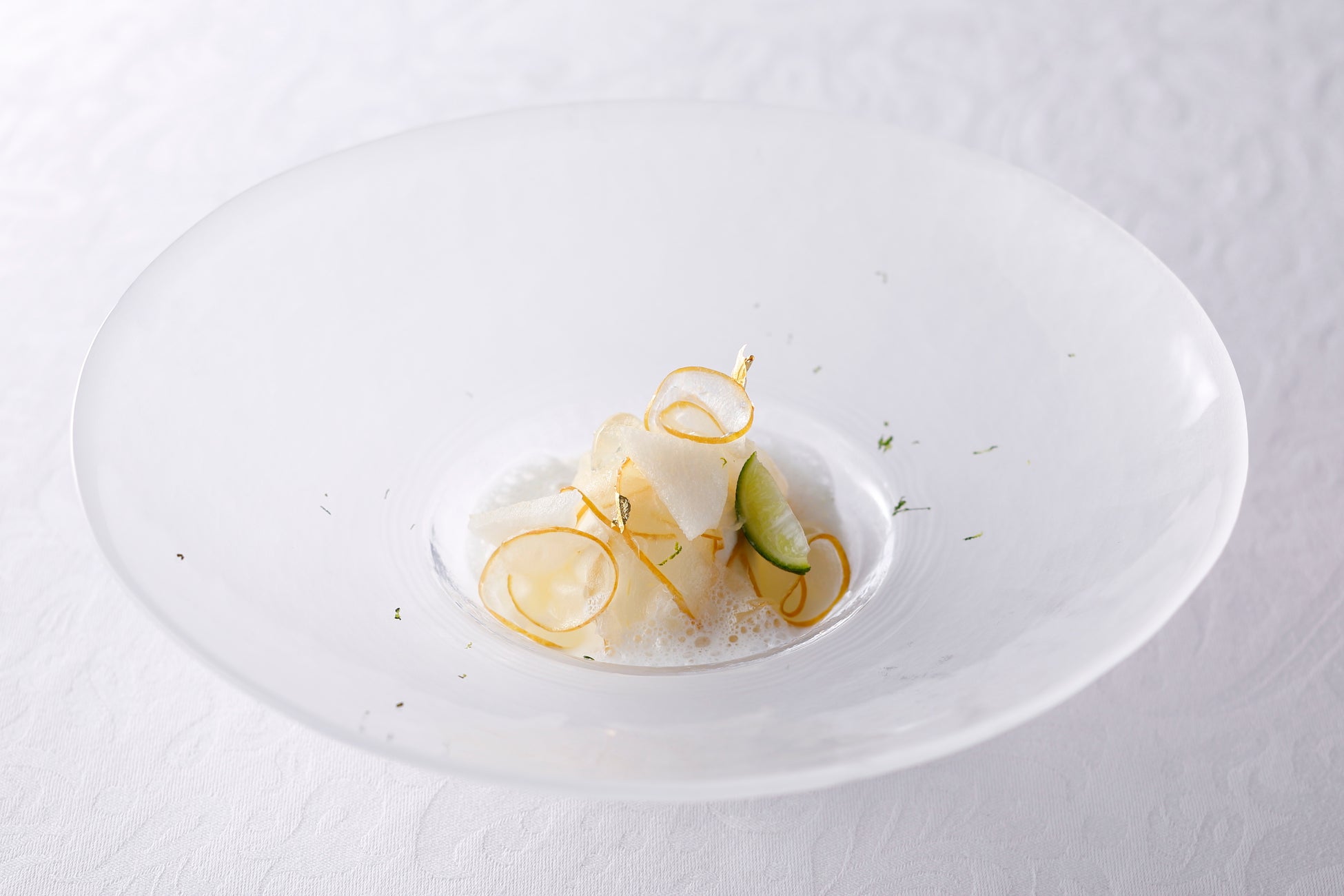 コースを締めくくるデザートは、『梨のタリアテッレ スープ仕立て』です。梨を薄くスライスしてコンポートにしたものをタリアテッレに見立てたこのデザートは、レモングラスのブランマンジェ、ヨーグルトのソルベ、すだちなどを使って仕立てました。清涼感のある味わいとシャキシャキとした梨の食感をお楽しみください。