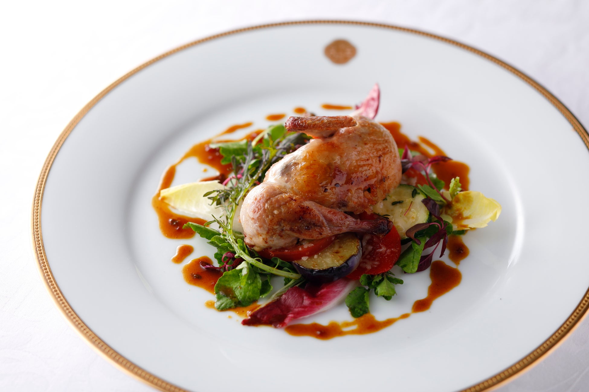 栗ときのこのリゾットを詰めたスペイン産カイユのロースト スパイシーなマデラソース