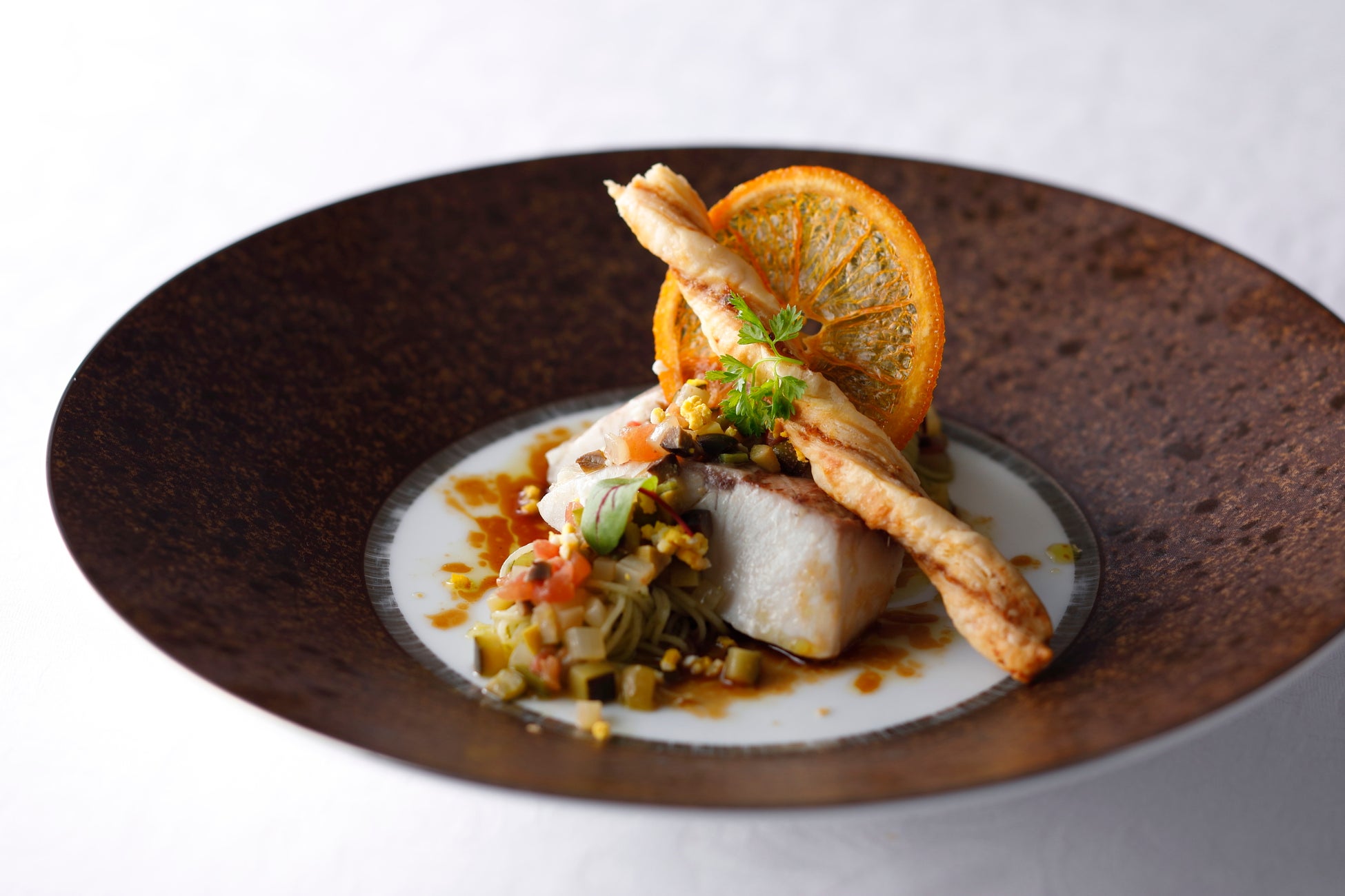 魚料理の『カンパチのコンフィ 抹茶香る香味野菜ソース“アロマート”』は、香味野菜のソースと抹茶オイルの豊かな風味でカンパチの美味しさを引き出した一皿です。仕上げに添えた爽やかなオレンジがアクセントになっています。