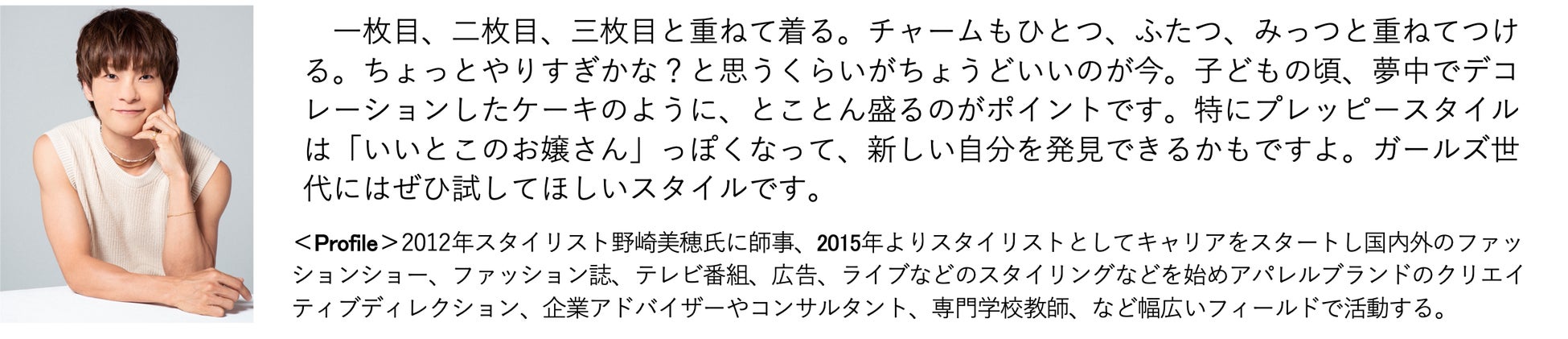 2005年よりスタイリストとして活動開始。雑誌でのスタイリングをはじめアーティストのCDジャケットやMV、広告、TVCMなどで活躍するかたわら、衣装デザイン、エディトリアルディレクション、アニメ衣装の監修、空間プロデュースなど多方面でも活動中。2021年に東京で開催されたパラリンピック閉会式では衣装ディレクターとして参加。著書に「Re BON bon!」(祥伝社)「kawaii図鑑」(文化出版局)などがある。