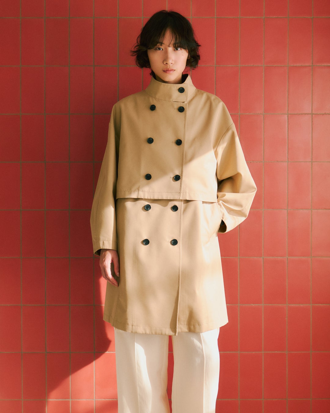 本製品は、2026年スプリングコレクションのシーズンコンセプト「ワークウェア イン ザ オフィス」を象徴するアイテムのひとつです。通勤にも休日にも対応するベーシックなデザインと、三通りで着られる実用性を備えた、オン・オフを横断する汎用性の高いコートです。