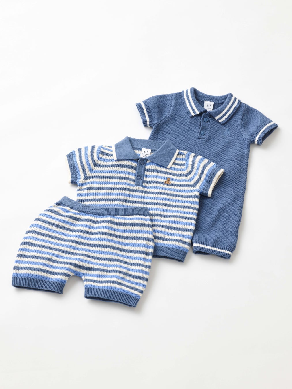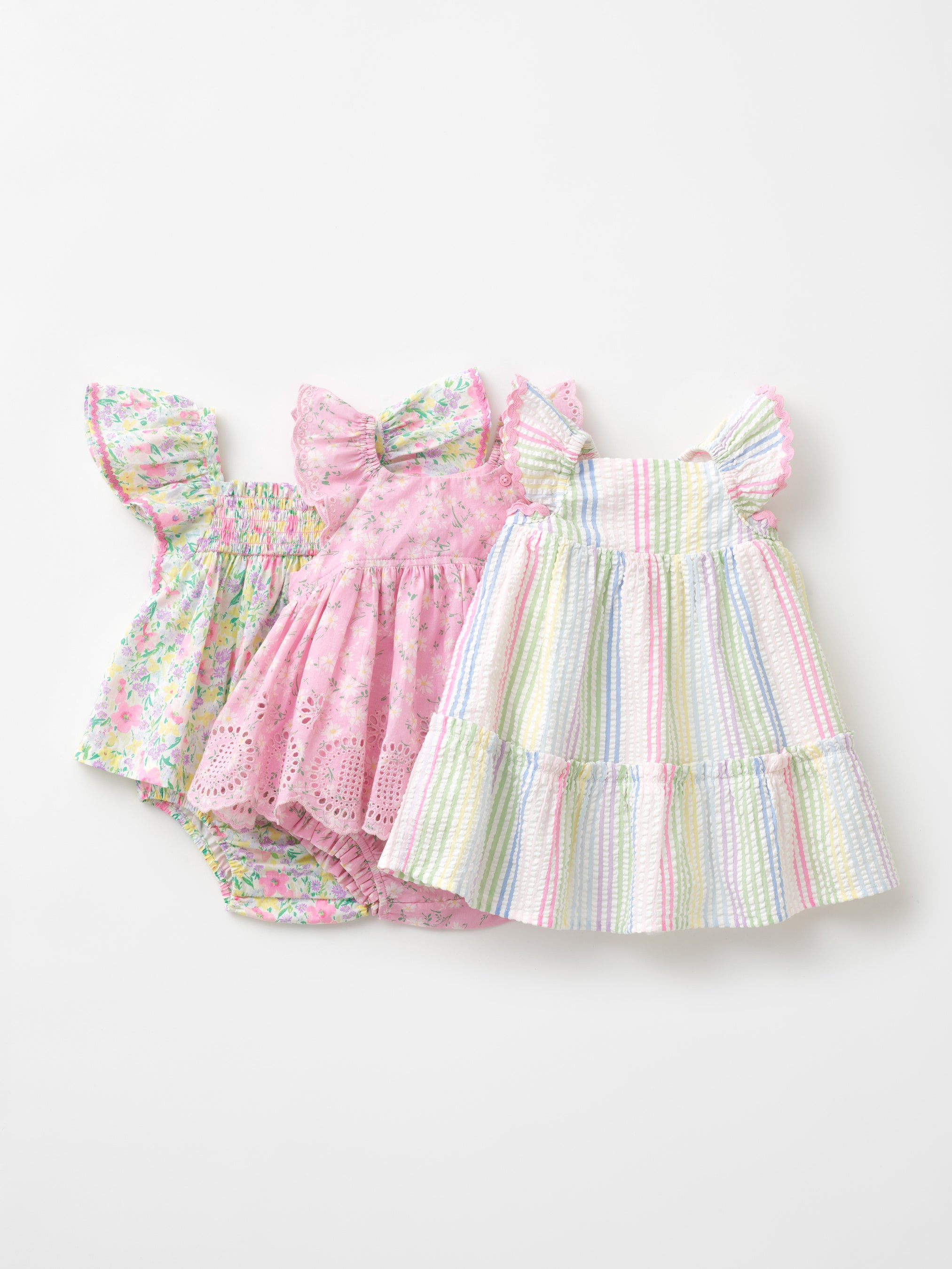左から) デニム ティアード ワンピース 5,990円 / スモッキングギャザー フラッタースリーブ ボディスーツワンピース 5,990円 / アイレット セット 5,990円 / シアサッカー ワンピースセット 6,990円 / デニム ショートオール 4,990円 / ポロ セーター セット 8,990円 / ポロ セーター ショートカバーオール 5,490円 *50~90cm展開