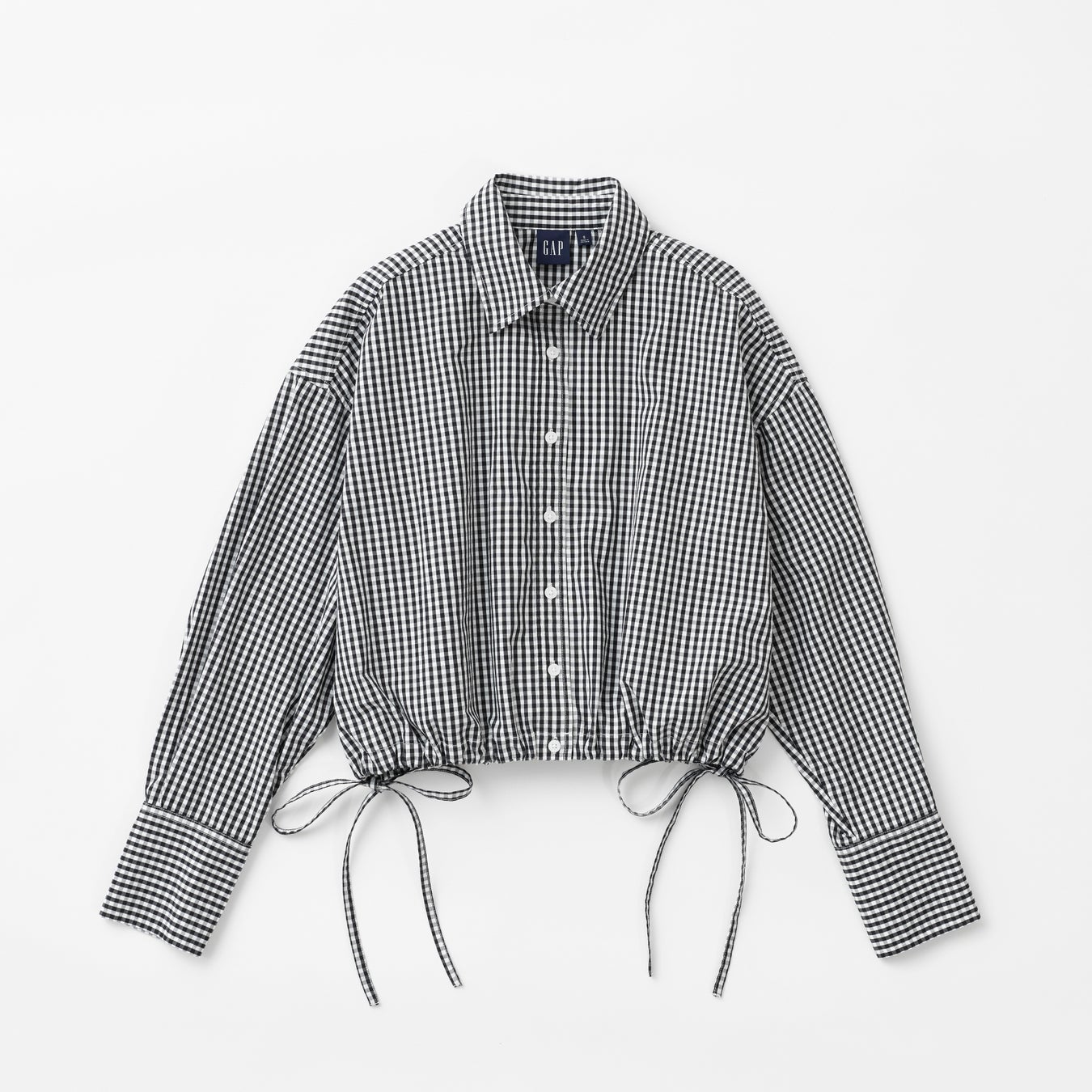 左から) ウルトラソフトデニム GAPロゴシャツ 9,990円 / ウルトラソフトデニム ミニスカート 7,990円 / ミッドライズ ウルトラソフト イージーウエスト バギーデニム 9,990円 / ポプリン オーバーサイズ 裾リボン クロップドシャツ 9,990円 / コットン100% ロールネックセーター 7,990円