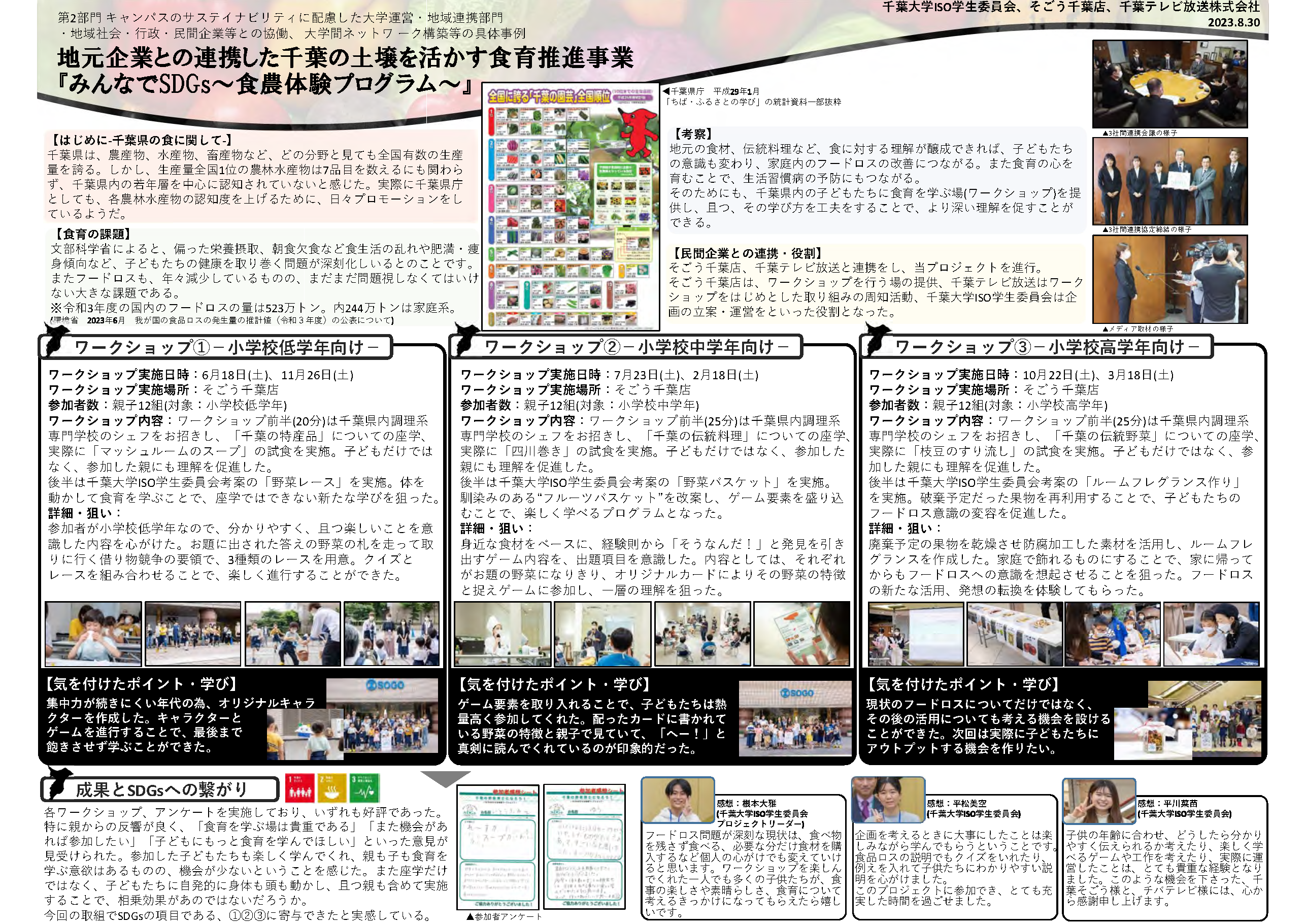 年に6回のそごう千葉店でのワークショップ、年に2回の体験プログラムを通じ、千葉の豊かな県産品を活かした食育活動を行いました。各プログラム内容は、千葉大学環境ISO学生委員会、千葉テレビ放送、そごう千葉店で、企画立案し、実行しました。各団体の強みを活かし、且つ地元放送局の媒体を活用し、活動の様子を県民に届けました。