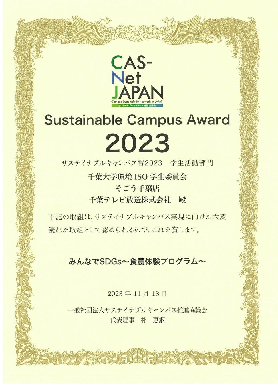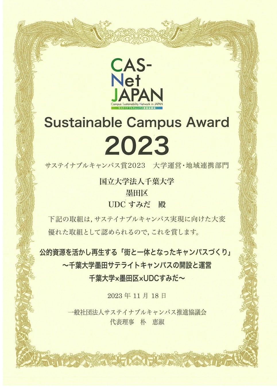 表彰式は2023年11月18日(土)に千葉大学墨田サテライトキャンパスで開催された、「サステイナブルキャンパス推進協議会2023年次大会」(主催:一般社団法人サステイナブルキャンパス推進協議会)において行われました。