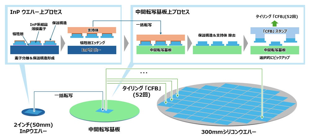 今回、2インチから300mmシリコンウエハーへのタイリング「CFB」技術を実証しました。本技術は3インチや4インチのInPウエハー、200mmシリコンウエハーなどにも柔軟に対応可能です。また、既存の光半導体製品にも応用でき、高放熱基板への転写による性能向上や、大口径化による生産性向上にも寄与します。