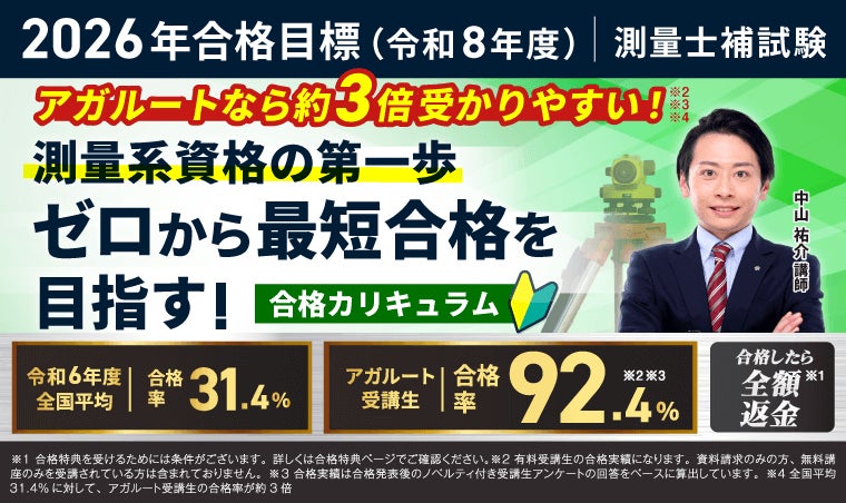 株式会社アガルート(本社:東京都新宿区、代表取締役:岩崎 北斗、以下「アガルート」)が運営する「アガルートアカデミー」は、2026年度合格目標の測量士補試験合格カリキュラム(フル・ライト)をリリースいたしました。