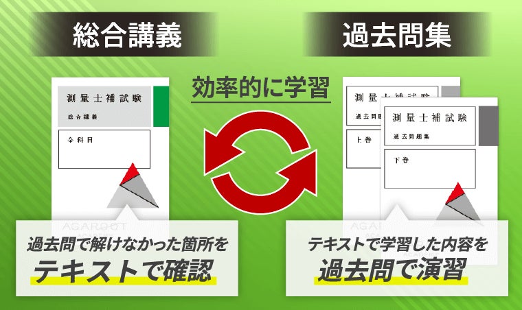 測量士補試験の特徴は「過去問が繰り返し出題される」ことです。テキストでの基礎学習と過去問集が連動するよう双方を行き来できる索引を掲載しており、合格の最短ルートで学習いただけるような教材にしました。