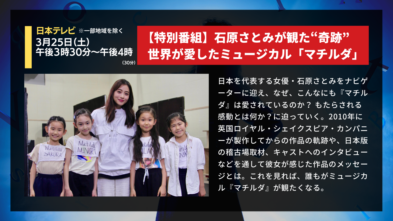 【いよいよ今週3/25放送!】日本テレビ/石原さとみが観た“奇跡”世界が愛したミュージカル「マチルダ」【秋元康コメント到着】