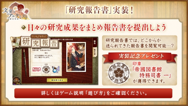 新コンテンツ「研究報告書」を追加いたしました。「研究報告書」とは、日々の研究成果をまとめ、報告書を提出するコンテンツです。自分が作成した報告書を確認するだけでなく、どこかから送られてきた報告書も閲覧することができます。さらに、実装記念プレゼントといたしまして、新報酬、印章『帝國図書館特務司書一』が獲得できます。
