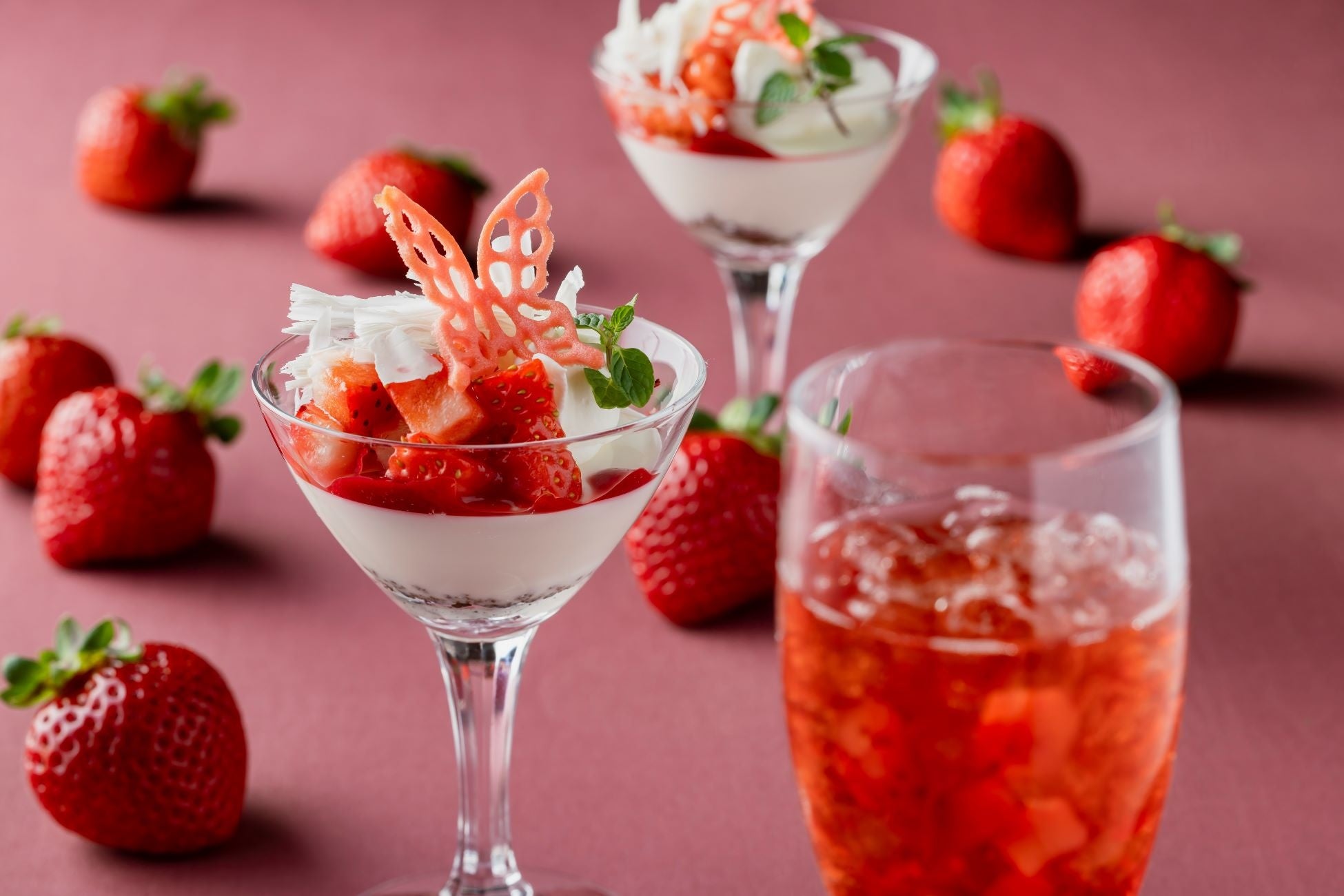 あまおうの甘さが凝縮された「あまおうの ミニパフェ 」と あまおうの程良い酸味と紅茶の甘みが口の中で爽やかに広がる 「あまおうの ティースカッシュ 」で贅沢時間をお迎えします。