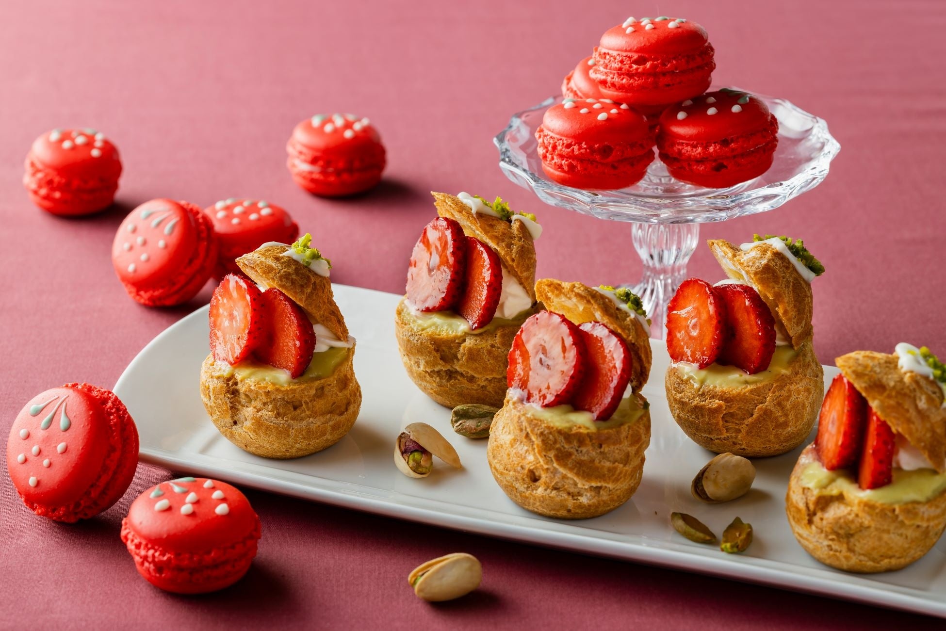 サクサクのシュー生地に、 濃厚な ピスタチオクリームと爽やかなあまおうをトッピング 。贅沢な味わいをお楽しみください 。