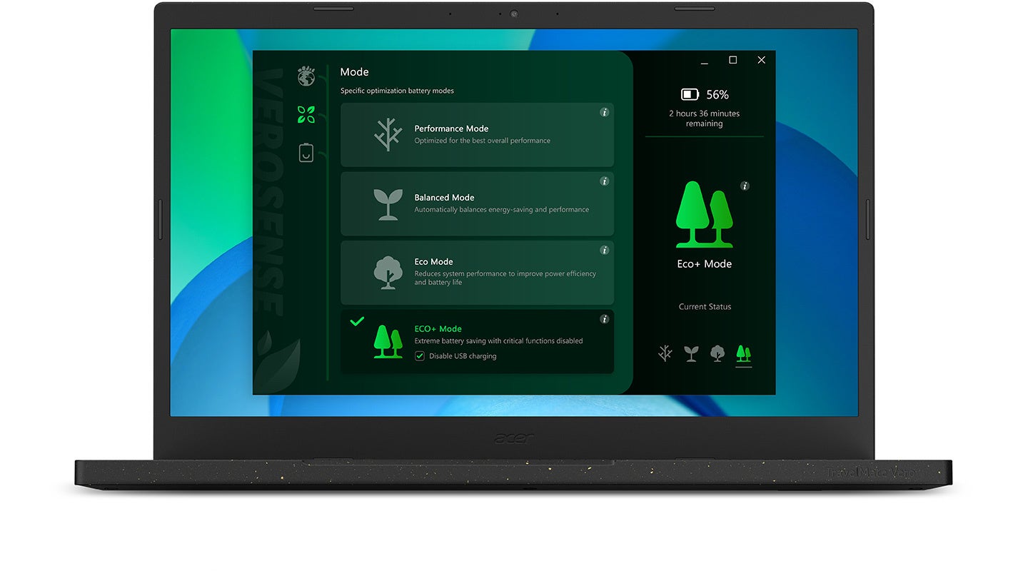 さらに、本製品群は企業での利用の利便性に考慮し、豊富な設定項目を持つプログラムであるAcer Commercial BIOSを搭載。BIOSロックによるデバイスの設定や多言語対応、セキュリティの強化など、企業での使い勝手を向上させる機能が充実しています。さらに、プリインストールソフトVeroSense(TM)では、製品の消費電力を抑えバッテリー寿命を延ばすための環境に配慮した使用目標を設定可能です。用途や目標に合わせてパフォーマンスモード、バランスモード、ECOモード、ECO+モードの4段階から設定することができます。