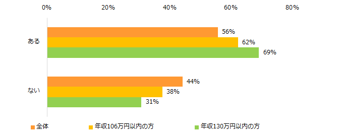現在扶養内で働いている方に、「これまでに年収の壁となる金額を超えないよう就業調整を行なったことはありますか?」と伺うと、全体では56%が「ある」と回答。年収の壁が106万円以内の方は62%、130万円以内の方は69%と、多くの方がこれまで調整していることが分かります。