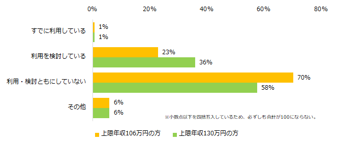 現在、年収上限106万円もしくは130万円の扶養内で働いている方に、“年収の壁・支援強化パッケージ”の利用状況について伺うと、「すでに利用している」はそれぞれ1%と、まだ少ない結果に。「利用を検討している」と回答した方も、上限年収106万円の方が23%、上限年収130万円の方は36%と、「利用・検討ともにしていない」の回答を下回る結果となりました。「利用を検討している」と回答した方の理由・利用における不安について、コメントを紹介します。