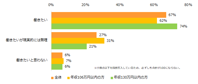 あわせて、「手取りが減らないとしたら、年収の壁を超えて働きたいと思いますか?」と伺うと、67%の方が「働きたい」と回答しました。その理由についても紹介します。