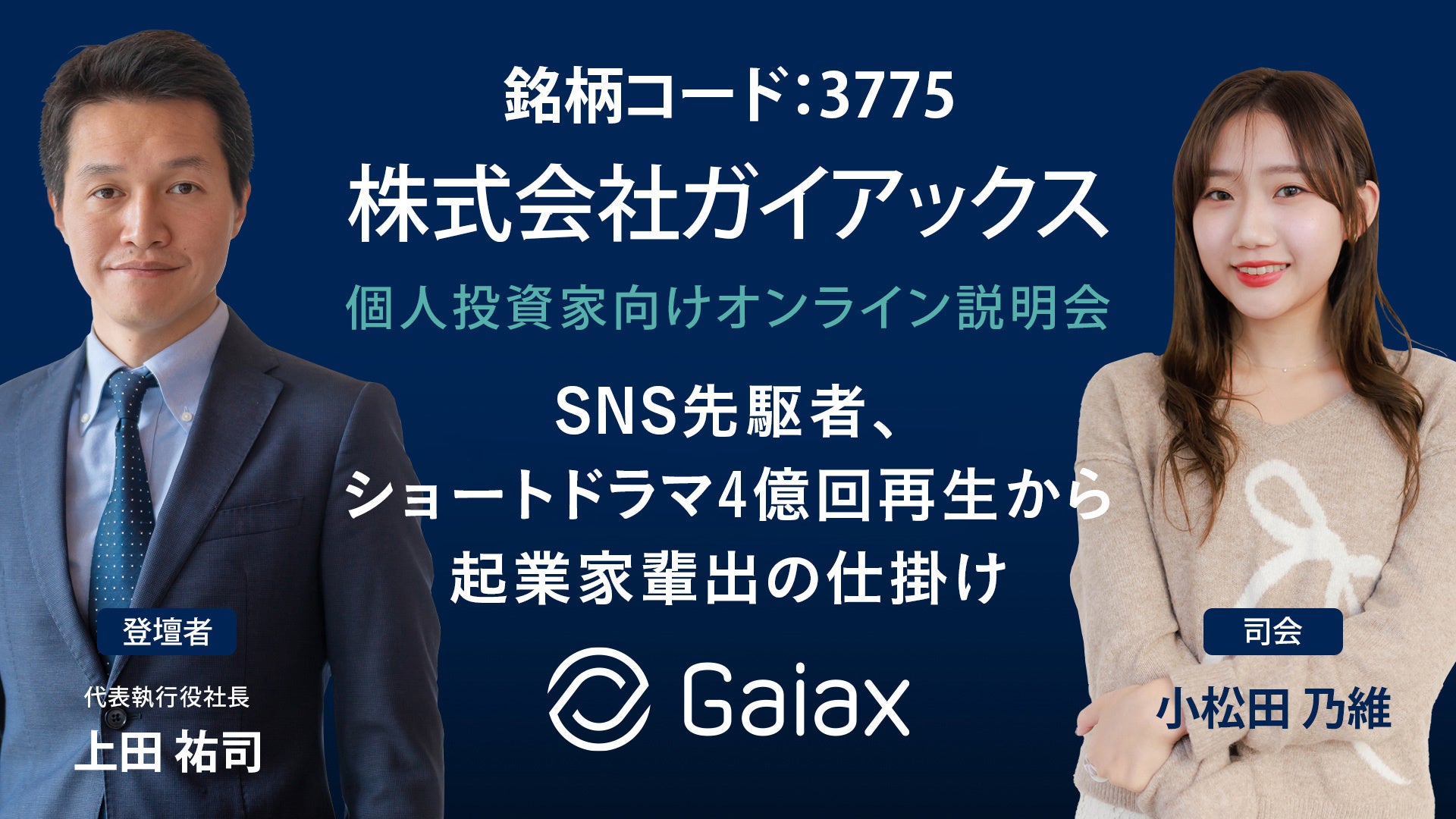 ガイアックスは「Empowering the people to connect 〜人と人をつなげる」をミッションに創業したスタートアップスタジオです。今年度より注力するショートドラマ事業では、自社IPの総再生回数が4億回を超え、クライアントのサービス・商品認知を目的としたタイアップ施策を開始。さらに、「スタートアップ育成5か年計画」を追い風に、スタートアップスタジオ事業への期待も高まっています。
